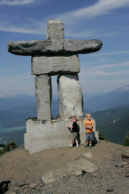 Boys slept until 8:30 a.m. -- this could have been the latest ever. Made breakfast, then headed back to the mountain and took the gondola up to the top. We wanted to go to the peak, but H & C still are not themselves. It's an open chair lift, and we didn't want to risk it. Still, the view was amazing. It was sunny and warm -- pretty much perfect. This is our second time here (Brian's 8th, or something like that), and I just am amazed how absolutely gorgeous it is. We took the gondola back down to the half way point, and got out to watch the beginning of the Canadian Downhill event. Actually ended up going down to a rock face to watch them, and joined some British blokes in cheering them on. It's amazing how fast and crazy these guys ride! Made dinner at the condo, hopped in the hot tub and crashed.